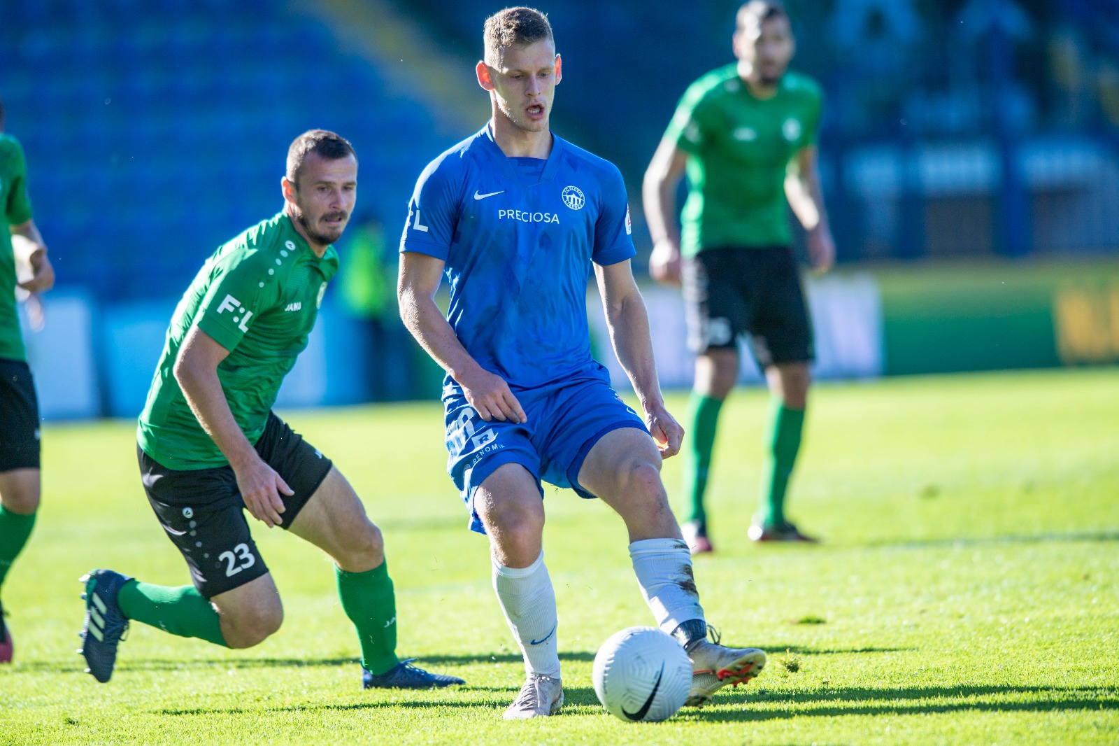 Ve 22. minutě byla k vidění pěkná akce, kterou vedli Hromada, Csáno a Mosquera. Poslední jmenovaný zkoušel zakončit, Melichar mohl zůstat v klidu, ani tentokrát zasahovat nemusel. Ve 37. minutě rozehrával standardní situaci Pilík, Nguyen měl zakrytý výhled, ale dokázal míč vyrazit. Ovšem pouze k Vávrovi, který vyslal tvrdou střelu, ta skončila na pravé tyči liberecké branky. Slovan si v závěru půle vytvořil dvě šance. Nejprve hlavičkoval na přední tyči Csáno, ale přestřelil. Poté si vytvořil slibnou pozici Matoušek, avšak trefil pouze rukavice připraveného Melichara.